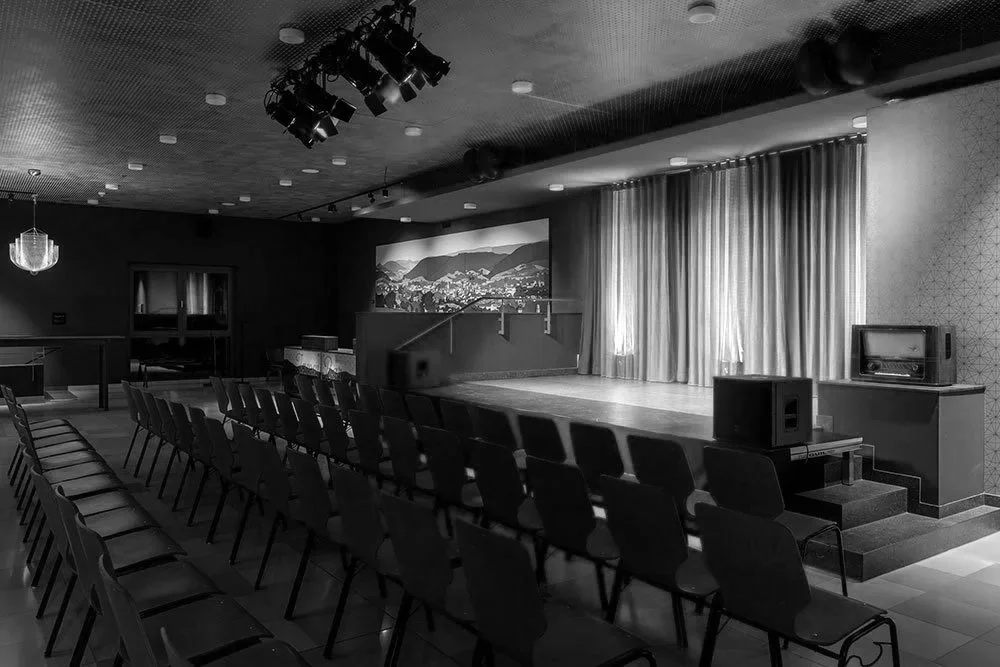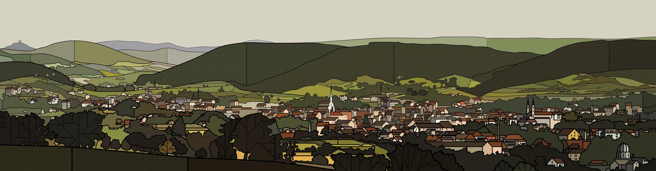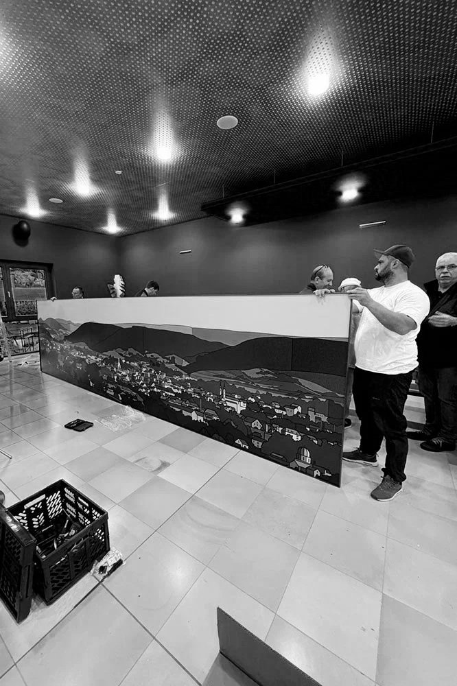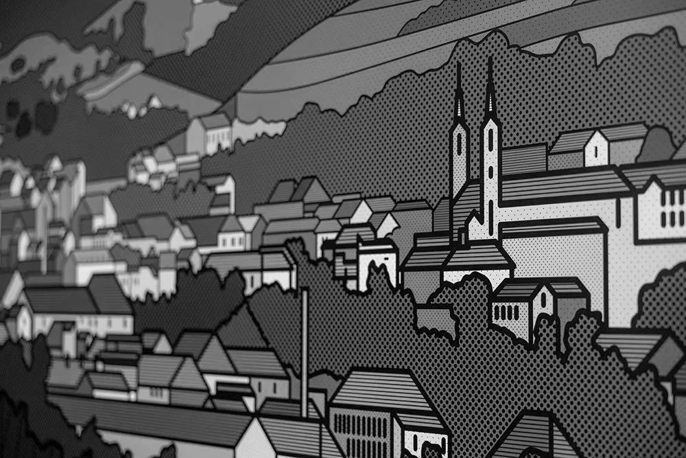 The large-scale mural, which depicts a historical panoramic view of the city of Lahr, was created specifically for the Parktheater. It presents Lahr in the 19th century in a very distinctive way. At first glance, it appears to be a modern interpretation of bygone times, but upon closer inspection, its true fascination unfolds: Ata Bozaci created the image using fine lines and dots that come together to form an impressive overall composition.