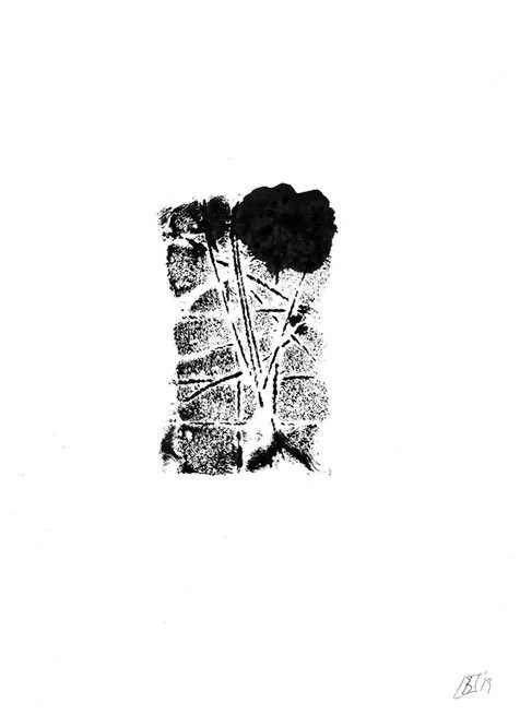 A monotype is a work that is printed manually and therefore each one is unique. The black paper is printed with highly pigmented silver. Silver reflects and black absorbs the light, so the contrast is particularly strong. This color combination is often used in “street bombing”.